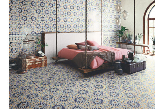Alhambra to kolekcja płytek ściennych i podłogowych o niezwykłej urodzie. Pokrywa je wzór patchworkowy, który też przywodzi nam na myśl kalejdoskopowe widoczki. Płytki dostępne są w wersji niebieskiej i zielonej, ściennej w rozmiarze 29,75x99,55 cm oraz podłogowej w rozmiarze 59,55x59,55 cm. Płytki są matowe, mają rektyfikowane krawędzie. Ścienne przeznaczone są wyłącznie do wnętrz a ich wzór cechuje delikatna struktura. Podłogowe są mrozoodporne i mają gładką powierzchnię. Kolekcję uzupełniają londony, listwy oraz jednokolorowe płytki dekoracyjne.
