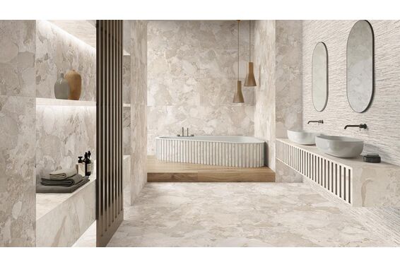 Ze względu na specyfikę produkcji płytek, mogą wystąpić różnice w odcieniach pomiędzy płytkami na ścianę, podłogę oraz dekoracjami (ściennymi, cokołami, listwami, stopnicami itp.). Więcej>>