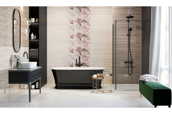 Glamour to kolekcja urokliwa, klasyczna i jednocześnie romantyczna. Wszystko za sprawą imitujących kamień płytek w dwóch kolorach: cream i beige oraz dekoracyjnych płytek szklanych ze wzorem, a raczej zdjęciem, kwiatów. Obydwa rodzaje dostępne w błyszczącym wykończeniu oraz rozmiarze 25x75 cm. Delikatniejsze dekoracje to płytki Premium z pasami wzdłuż dłuższego boku oraz Geo ze wzorem imitującym mozaikę o ciekawych elementach sześciokątnych. Dla lubiących mozaiki jest również i taka w rozmiarze 24x30 cm z elementami z sześciokątów. Cała kolekcja jest nierektyfikowana i niemrozoodporna.