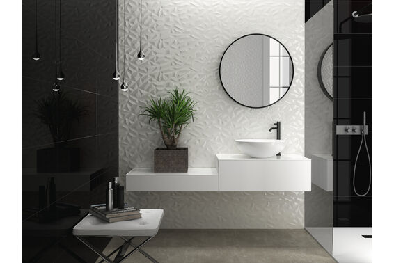 Studio jest kolekcją ściennych, niemrozoodpornych płytek w dwóch kolorach: białym i czarnym. Rektyfikowane płytki dostępne są w rozmiarze 35x100 cm, dając nam możliwość uzyskania jednolitej powierzchni dzięki dużemu rozmiarowi i zastosowaniu minimalnej szerokości fugi. Płytki ścienne dostępne są w czterech wersjach: dwie bazowe gładkie - white i black, dwie dekoracyjne w kolorze white ze wzorami z efektem 3D. Błyszcząca powierzchnia dodaje szyku. Kolekcja do nowoczesnych łazienek i kuchni a sięgając tylko po płytki bazowe - do każdego praktycznie stylu.