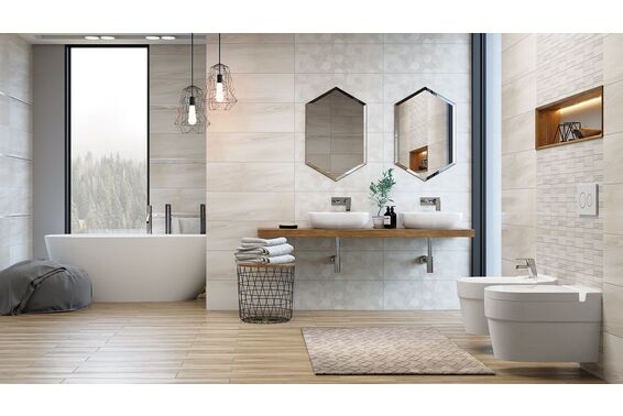 Ze względu na specyfikę produkcji płytek, mogą wystąpić różnice w odcieniach pomiędzy płytkami na ścianę, podłogę oraz dekoracjami (ściennymi, cokołami, listwami, stopnicami itp.). Więcej>>