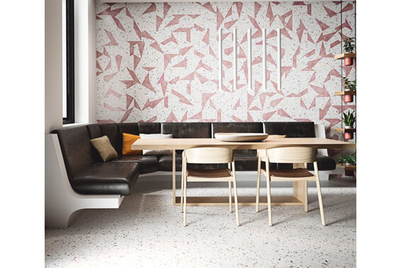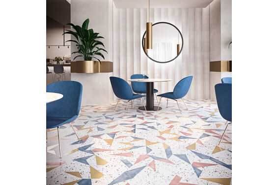 Stracciatella to kolekcja płytek podłogowych dla odważniejszych. Znajdziemy w niej cztery wersje płytek, które pokrywa wzór imitujący białe lastryko, który obecnie wraca do stylizacji domowych. Jedna wersja to płytka cała pokryta tym wzorem, a w trzech pozostałych płytki mają element w jednym z trzech kolorów: różowym, miodowym lub niebieskim. Wszystkie są mrozoodporne, mają matowe wykończenie oraz rozmiar 25x29 cm. Dodatkowo są antypoślizgowe w klasie R9.