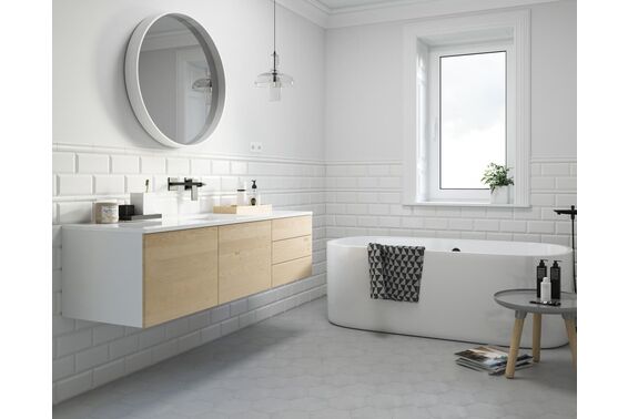 Ze względu na specyfikę produkcji płytek, mogą wystąpić różnice w odcieniach pomiędzy płytkami na ścianę, podłogę oraz dekoracjami (ściennymi, cokołami, listwami, stopnicami itp.). Więcej>>