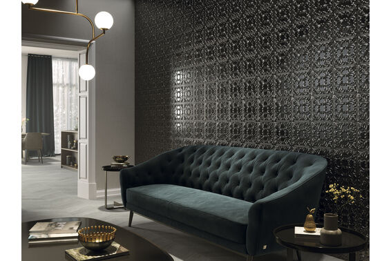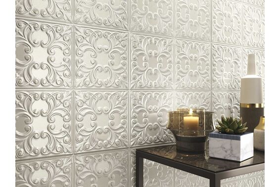 Tin Tile jest kolekcją płytek ściennych, których wymiar wynosi 44x44 cm. Te przeznaczone do wnętrz mieszkań oraz na zewnątrz domów płytki są mrozoodporne i nierektyfikowane. Ich powierzchnia, podzielona na 4 kwadraty powstała z kwiatowej, strukturalnej dekoracji, która zmienia się w zależności od padania światła. Dzięki temu mamy wrażenie ruchu i rytmu. Płytki z satynowym wykończeniem dostępne są w pięciu barwach: black, zinc, pearl, iron i copper.