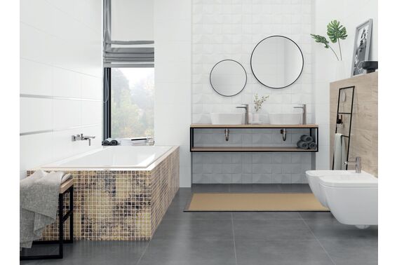 Ze względu na specyfikę produkcji płytek, mogą wystąpić różnice w odcieniach pomiędzy płytkami na ścianę, podłogę oraz dekoracjami (ściennymi, cokołami, listwami, stopnicami itp.). Więcej>>