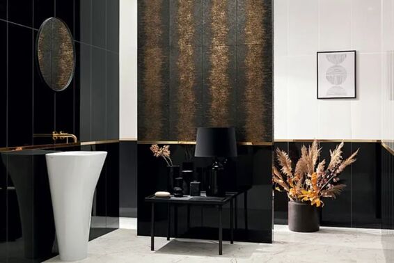 Jednym z wyróżniających elementów kolekcji Tubądzin Stardust są dekoracje, które stanowią mocny i wyrazisty element wzoru. Złote pasy na białej lub czarnej strukturze płytek dodają im wyjątkowego charakteru. Dzięki temu każde wnętrze zyskuje niepowtarzalny i ekskluzywny wygląd.Kolekcja Stardust została zainspirowana gwiezdnym pyłem i rozbłyskami supernowych, które emitują intensywne światło w kosmiczną przestrzeń. Złoty wzór na płytkach przypomina ten efekt, tworząc nieziemsko eleganckie i tajemnicze wnętrza. Płytki dekoracyjne z kolekcji Stardust tworzą także szlachetny wzór tapetowy ze złotymi pasami, dodając wnętrzom dodatkowego uroku i wyrafinowania.